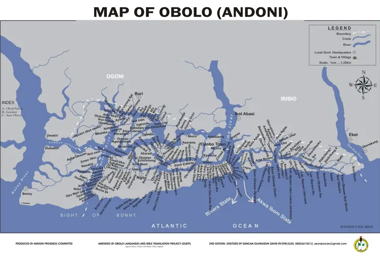 Obolo homeland occupies an estimated area of about 360km2 with a projected population of about 260,000 people.   It lies about 4o31N latitude and 7o301E longitude falling within the south-eastern flank of the Niger delta, a region rich in oil and gas.  Its land mass transverses the chains of islands between the Qua Iboe River in the east and Andoni River in the west.  It is bounded by Bonny to the west, Okrika and Ogoni to the north, Ibibio to the North-east and the majestic Atlantic waters to the south.  Its proximate position to the sea and location within the Niger delta belt, account for the intricate network of salt-water creeks once teaming with marine life.  Obviously, the people’s mainstay and basic industry is fishing.  Unfortunately, oil pollution is drastic, reducing their income per capita below sustenance level thus crippling their industrial and economic reliance.
